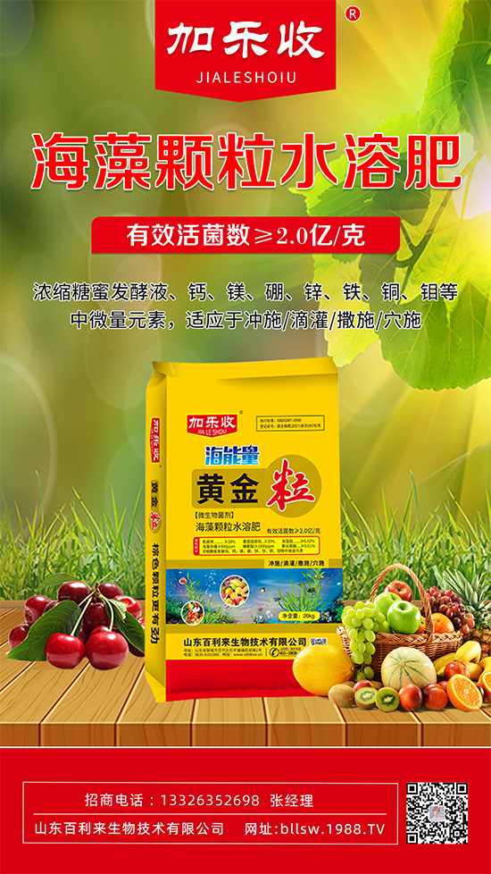 山東百利來生物技術有限公司【海藻顆粒水溶肥-黃金!渴歉鶕寥蓝嗄赀B作重茬種植、施肥嚴重過量導致的有益菌過度消耗、土壤板結、鹽漬化,嚴重影響作物根系對土壤中養(yǎng)分的吸收利用。本品在研制中把氮、磷、鉀、中微量元素進行合理配比,特別添加功能性有益菌群、海藻酸、海藻多糖、黃腐酸鉀、脯氨酸、聚谷氨酸等有機載體,應用生物雙螯合技術螯合而成。