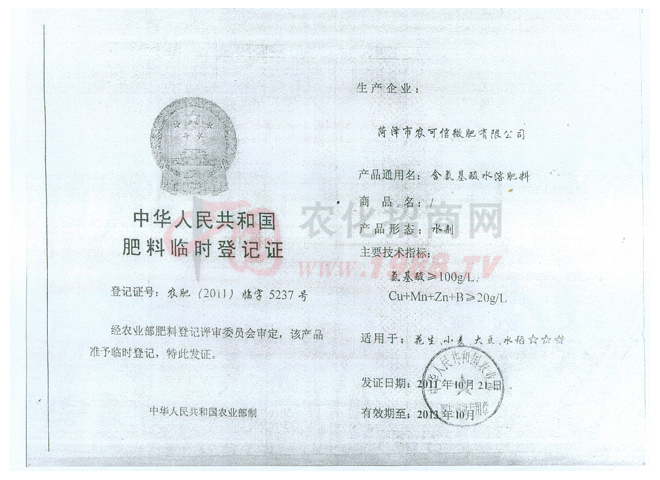 • 肥料臨時登記證肥料臨時登記證