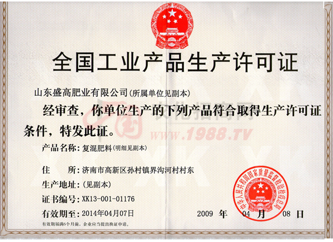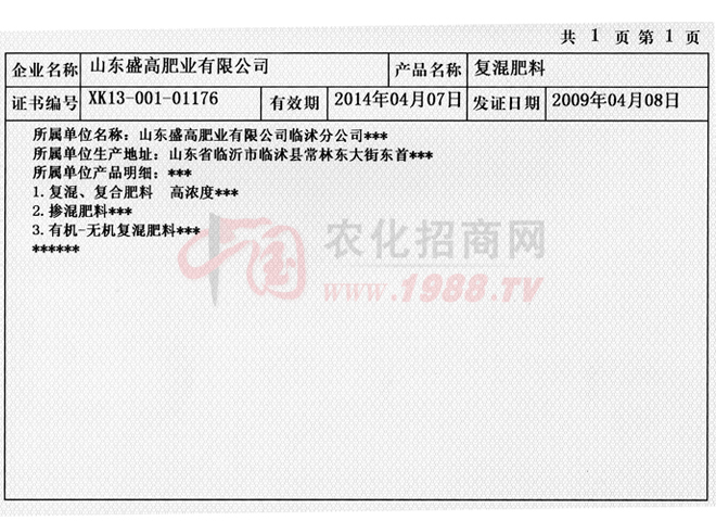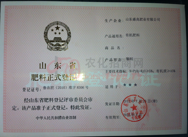 證書名稱:肥料正式登記證 發(fā)證機構(gòu):山東省農(nóng)業(yè)廳
