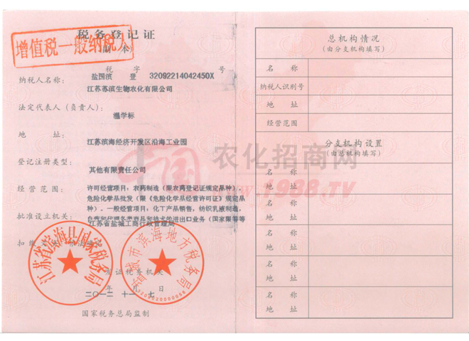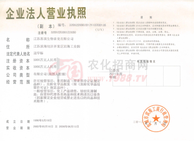 企業(yè)創(chuàng)建于1995年,是國家農(nóng)藥定點(diǎn)生產(chǎn)企業(yè),主要從事原藥合成,制劑加工復(fù)配,主產(chǎn)品“蘇濱”牌“豐之源”、“禁紋”由中國農(nóng)業(yè)大學(xué)植物生態(tài)工程研究所研制,系國家星火計(jì)劃項(xiàng)目,被評為鹽城市產(chǎn)品,產(chǎn)品銷售網(wǎng)絡(luò)覆蓋全國十多個省市,F(xiàn)擁有資產(chǎn)13000萬元,注冊資金5000萬元,占地面積70000㎡,建筑面積14800㎡,職工128人,其中專業(yè)技術(shù)人員43人,2012年銷售2億元,利稅達(dá)3000萬元。